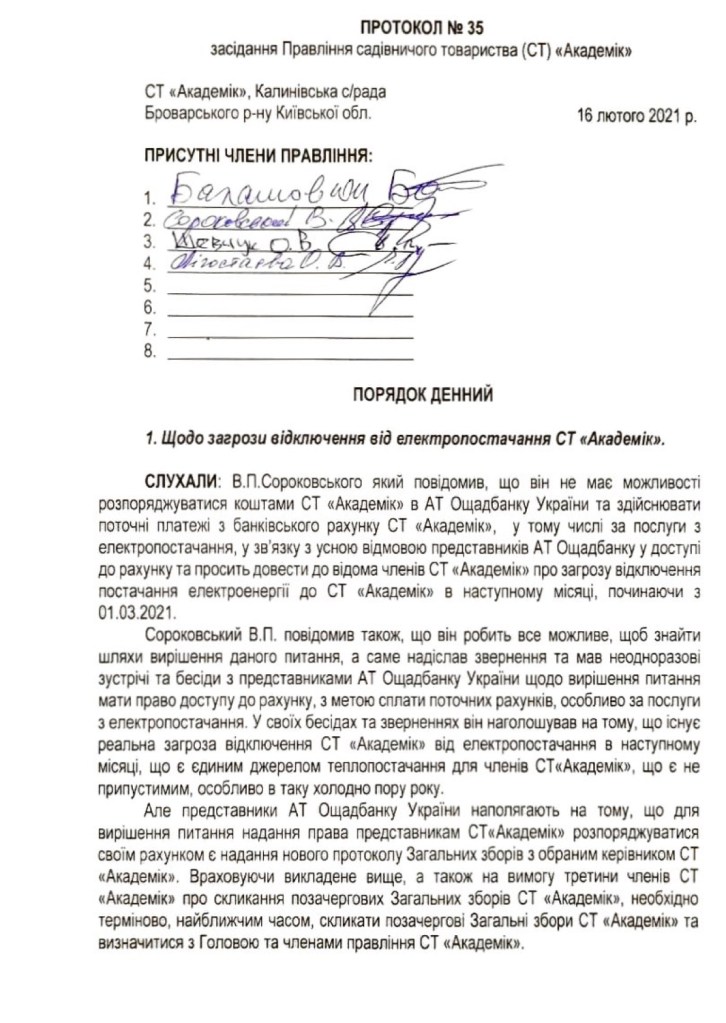 Протокол засідання №35 Правління СТ «Академік» від 16.02.2021 року